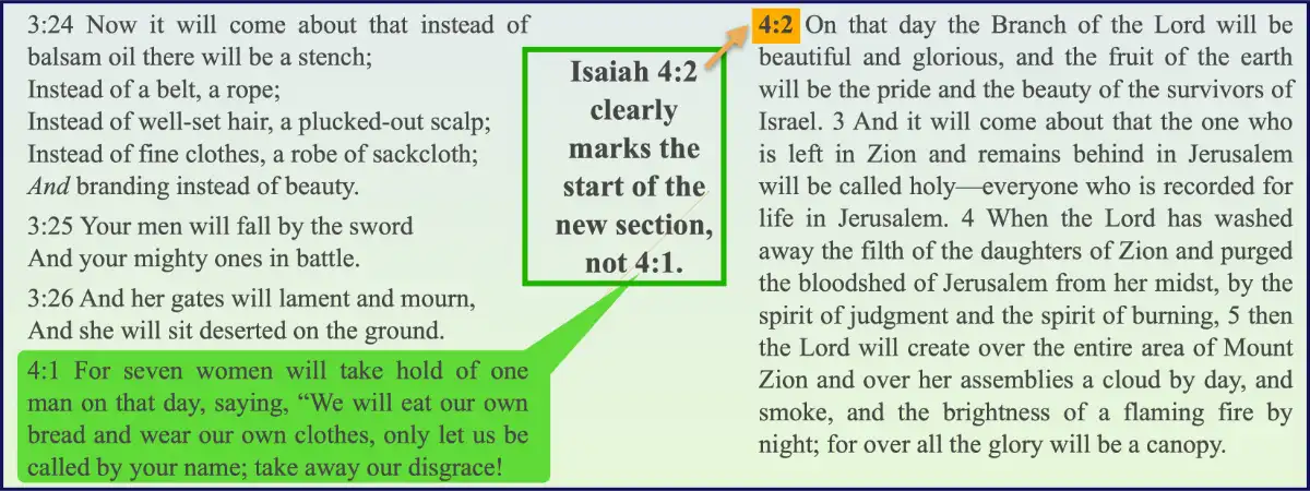 There is a good reason for confusion about Isaiah 4:1. The answer lies in its placement in modern Bibles, with added chapter and verse markers. In the 1200s, Langton introduced chapter markers for the Vulgate translation. These chapter and verse markers are not divinely inspired and contain numerous errors, such as in Isaiah 4:1.